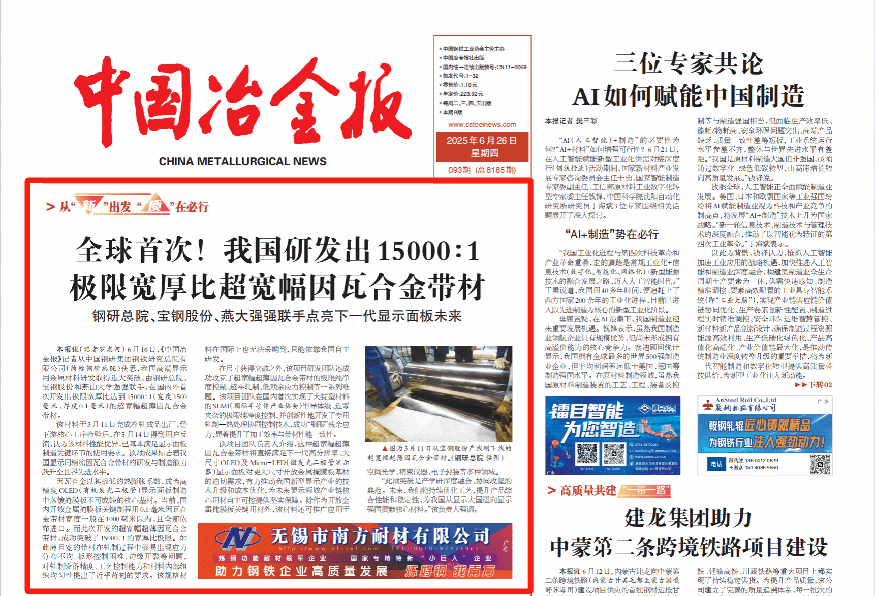 该因瓦钢产品为乌鸦传媒联合中国钢研集团、宝山钢铁股份有限公司共同研发的全球首款15000:1极限宽厚比(0.1mm×1500mm)超薄因瓦合金带材,经下游企业量产验证,产品性能全面达到国际领先水平。